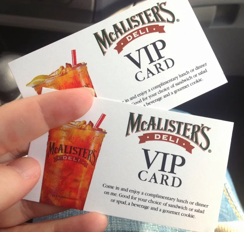 (2) McAlister’s Deli VIP Cards redeemable for a lunch or dinner combo at McAlister’s Deli
